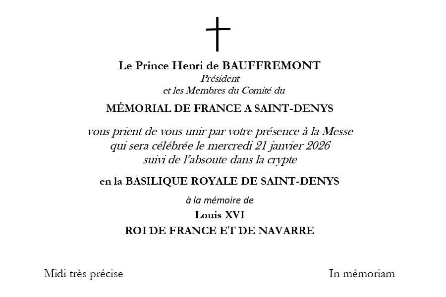Le Mémorial de France à Saint-Denys assure la pérennité de l'ordonnance du roi Louis XVIII, en date de 21 janvier 1815, qui fonda les messes perpétuelles à la mémoire du roi Louis XVI et de la reine Marie-Antoinette, célébrées sans interruption depuis sa promulgation, sauf pendant les périodes de guerre.